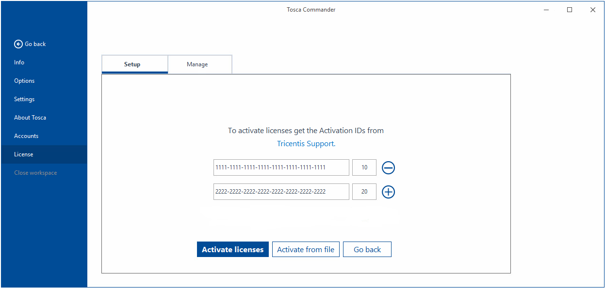Wählen Sie auf der Registerkarte Setup die Option Activate licenses.