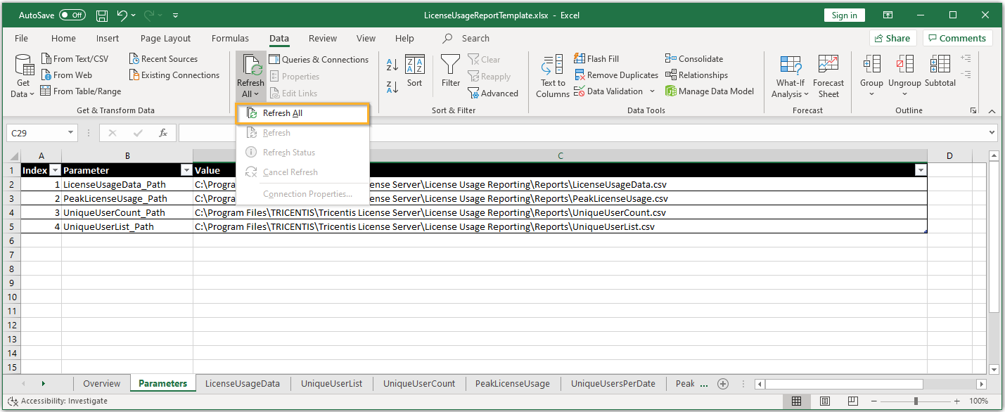 Nachdem Sie nun die Lizenznutzungsdaten abgerufen haben, können Sie einen Bericht in Microsoft Excel erstellen. Tricentis bietet eine vorbereitete Vorlage: LicenseUsageReportTemplate.xlsx, die sich unter C:\Program Files\TRICENTIS\Tricentis License Server\License Usage Reporting\Reports befindet.