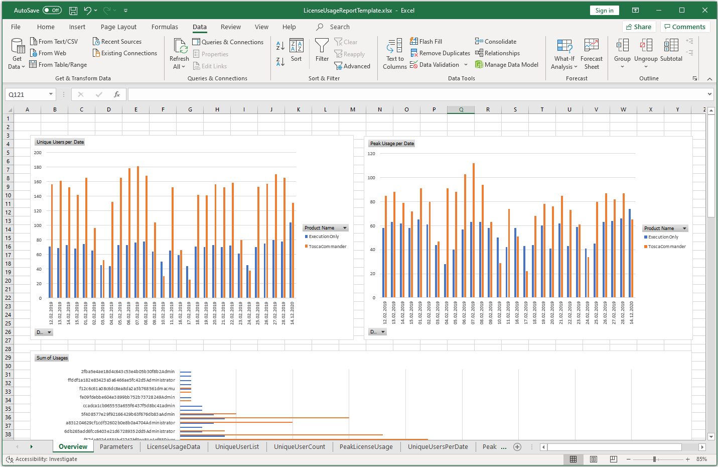 Klicken Sie in Ihrem Arbeitsblatt auf Overview, um den Lizenznutzungsbericht in Grafiken anzuzeigen.