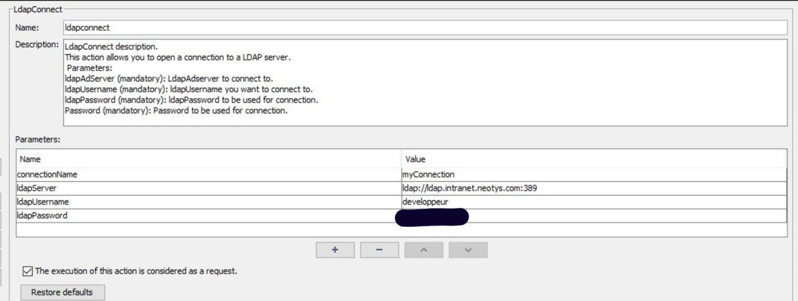 LdapConnect establishes a connection to an LDAP server. Use this action to authenticate and set up communication with the LDAP server.