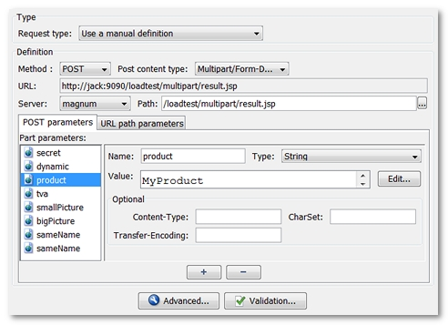 Each part is described by a name attribute and a value. It also features an optional specific content type, charset and transfer encoding. For more information, see RFC1867: http://www.ietf.org/rfc/rfc1867.txt. Each field may be replaced by a variable. The value may be a string or a file input.