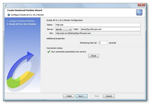 To define the connection to an Oracle Application Server using this monitor requires that the DMS (Dynamic monitoring System) library be activated. By default, it is activated on OC4J (Oracle Container 4 Java) servers version 10g.