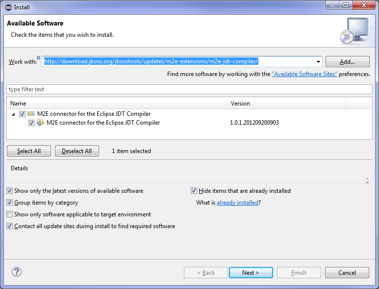 In the Work with: field, enter http://download.jboss.org/jbosstools/updates/m2e-extensions/m2e-jdt-compiler/.