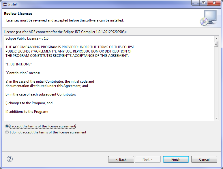 Click Next> twice, accept the terms of the license and click Finish.