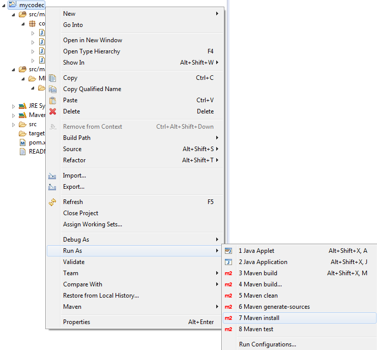 To generate the JAR of your Encoder/Decoder into the output directory of your user directory: Right-click on your Java project and select Run As > Maven install.