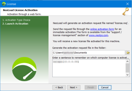 The Activation through a web form option makes it possible to manually manage the activation of the installed license. With this option, a license.req file for the activation request is created. The file must be sent to the NeoLoad central license server. It must be attached in the Activation Form on the License Management section. The NeoLoad central server sends back a .lic file to download or in an email. The .lic file is the activated license key to enter in NeoLoad.
