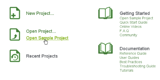 In the Welcome panel, navigate to Open Project or Getting Started.