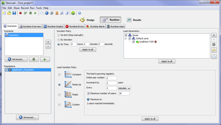 In the Scenarios tab, choose a scenario and a Population for the test. Specify the test parameters (length, load, number of Virtual Users, and so on).
