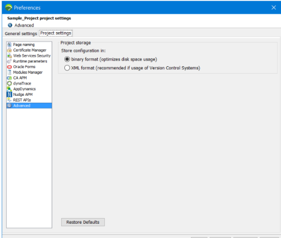 To configure the advanced settings of a project, select Edit > Preferences > Project settings >Advanced.