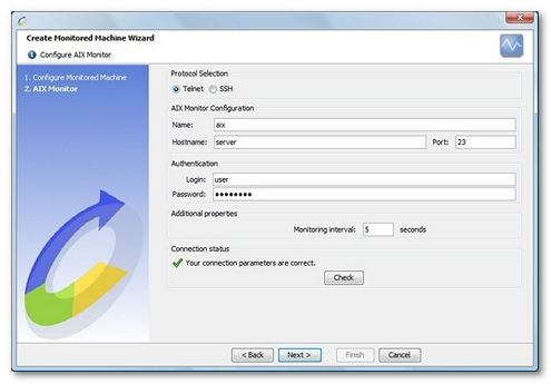 Defining an AIX connection to a server requires the name or IP address of the machine to be monitored, as well as the connection port. The standard access ports are port 23 for the Telnet protocol and port 22 for the SSH protocol.