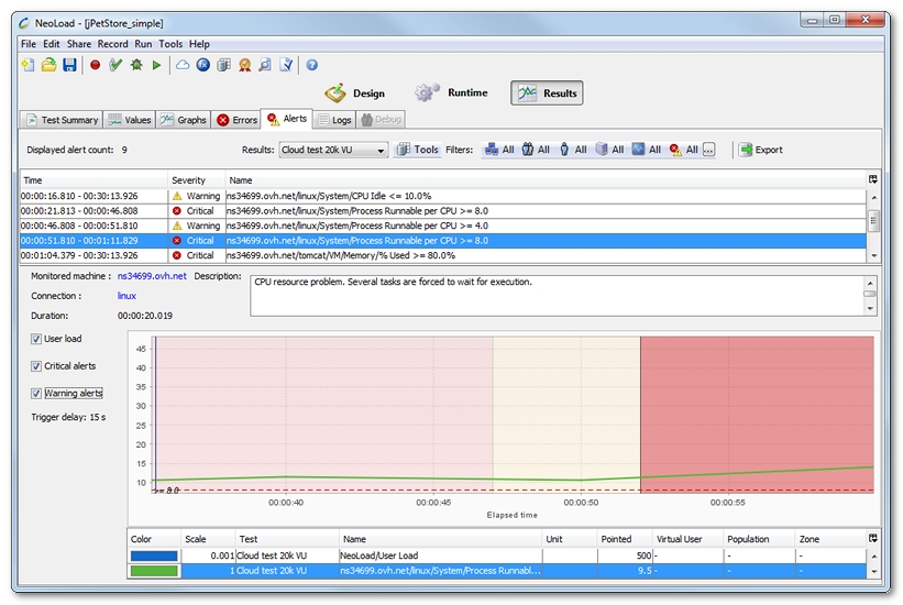 TheAlerts tab displays details of the alerts that were triggered on performance counters during the test.
