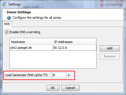 To set the TTL of DNS cache for Load Generators, enter a value in seconds in the Load Generator DNS cache TTL field.