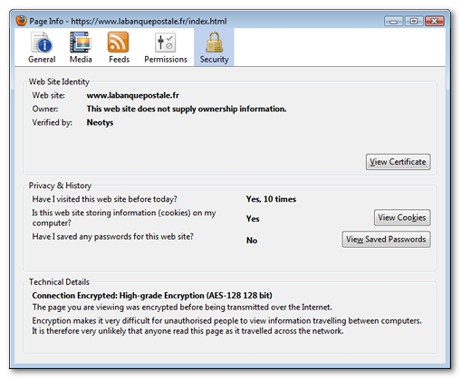 When recording using SSL, Firefox displays a closed padlock in the bottom right-hand side corner of the browser window to indicate that the data being transferred is secured. The details of the certificate generated by NeoLoad can be viewed by clicking on the padlock. The certificate is authenticated by the Neotys certificate authority.