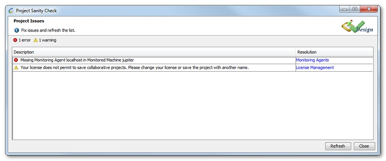 The Refresh button must be clicked to update the list whenever changes are brought to the test design. The Execution Sanity Check dialog is non-modal, making it possible to check and fix issues at the same time.