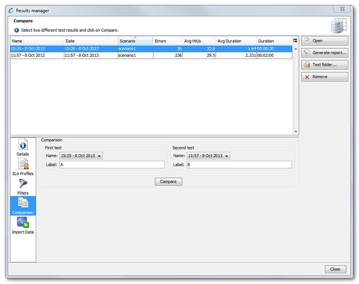 This makes it possible to compare the results of two tests. The more similar the designs of the Virtual Users are in both tests, the more relevant comparing the results is. It is advised to compare two test results with the same User Paths, but with different scenarios (different load policies, different durations, and so on).