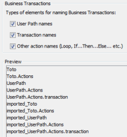 When the Nudge APM integration module is enabled, the context for the transaction names are made of the User Path names, Transaction names, and other action names by default. In the Nudge APM preferences panel, the Business Transactions group box makes it possible to select which element must be included in the transaction names.