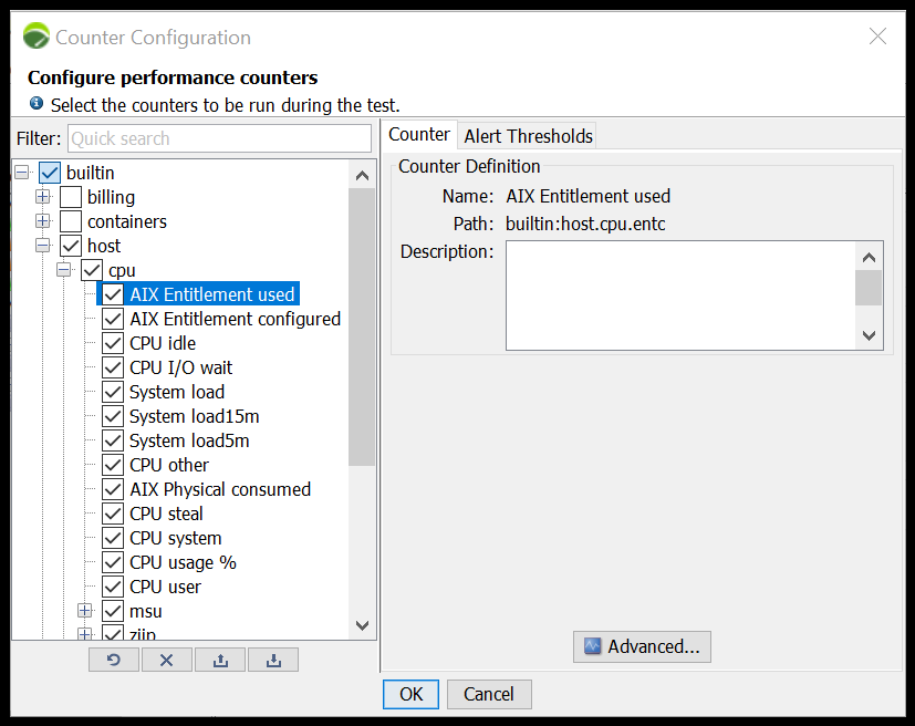 All counters and categories available in Dynatrace are listed, some are suggested by default by NeoLoad.