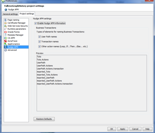 In the NeoLoad menu bar, click Edit > Preferences > Project settings > Nudge APM.
