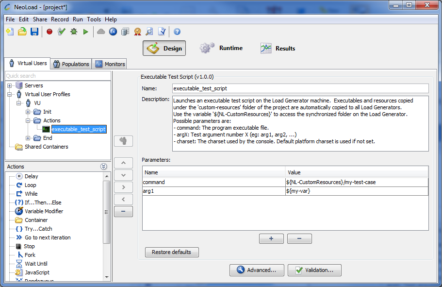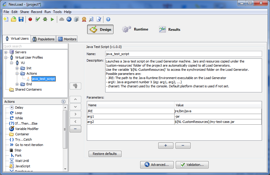 The default JRE used by the Java Test Script Advanced action is the JRE of NeoLoad. If you are using NeoLoad 64-bit and if a 32-bit JRE is required for the libraries of the third-party tool you are using (such as Jamo), make sure to install a 32-bit JRE on the machine and update the JRE parameter to point to the correct JRE.