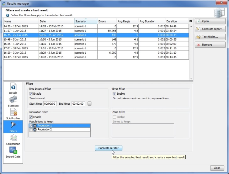 Select the test results to be filtered in the drop-down list of results, or open the results manager and select the test results to filter.
