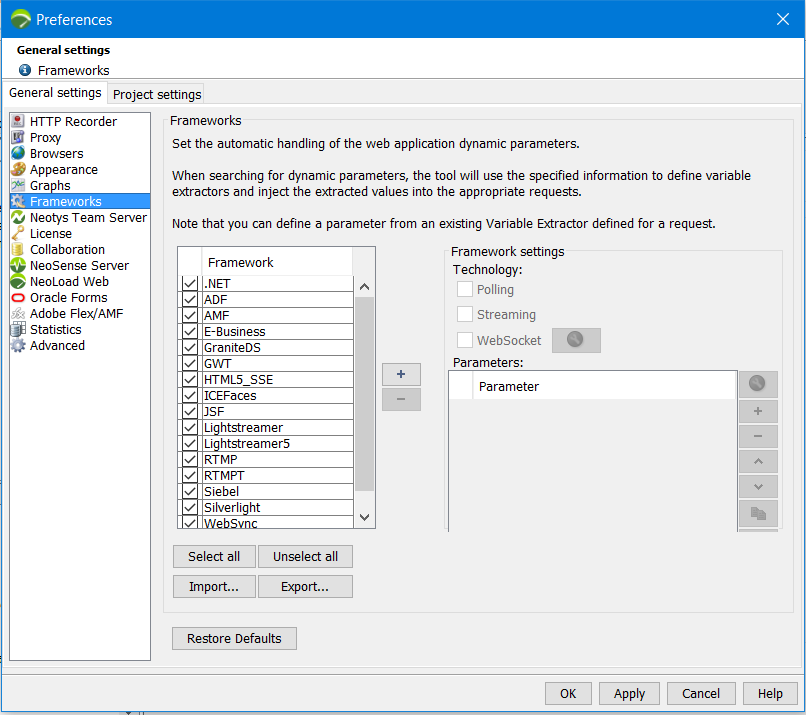 The Frameworks panel allows you to define rules for NeoLoad to configure the User Path automatically after a recording.