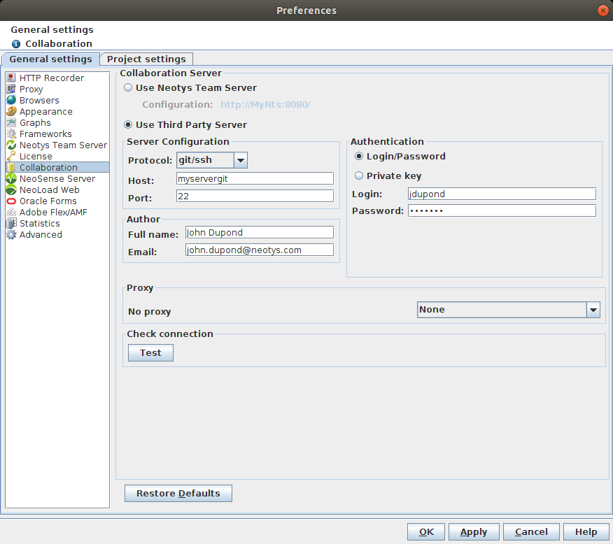 The Use Third Party Server section makes it possible to enter the parameters of the collaborative server after the protocol selected in Protocol. The Test button helps check the connection. When the parameters specified to connect to the server are inaccurate, an error message is displayed. When the accessed server is in SSH or in tunnel, the message is in the language of the server installation.