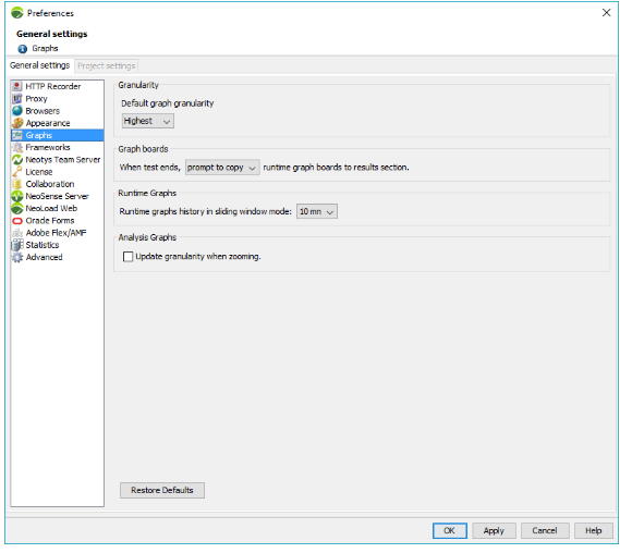 The Graphs panel allows you to configure the graphs displayed by NeoLoad in the Runtime and Analysis sections.