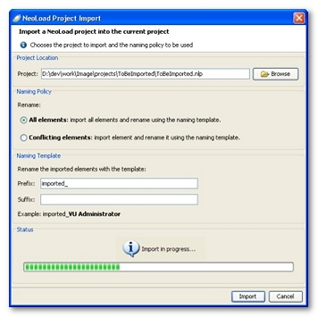 The imported resources (servers, pages, Virtual Users, Populations ...) must not already exist in the current project under the same name. If a resource does already exist, NeoLoad will prompt you to rename the resource to be imported in order to avoid any conflicts.