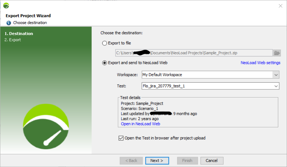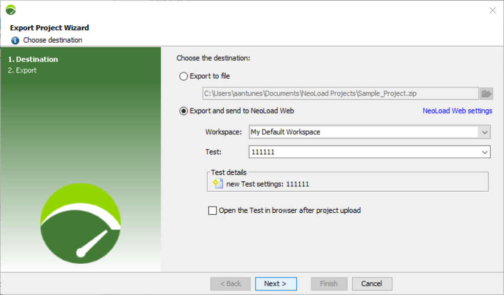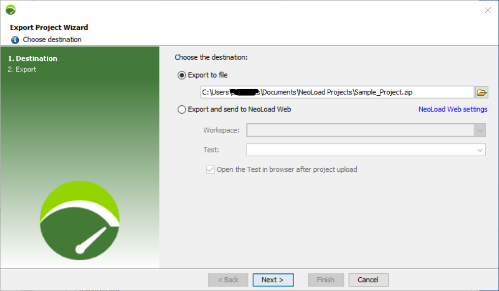 Export to file: NeoLoad will export and zip your project into an archive file and store it locally in the location you specify.