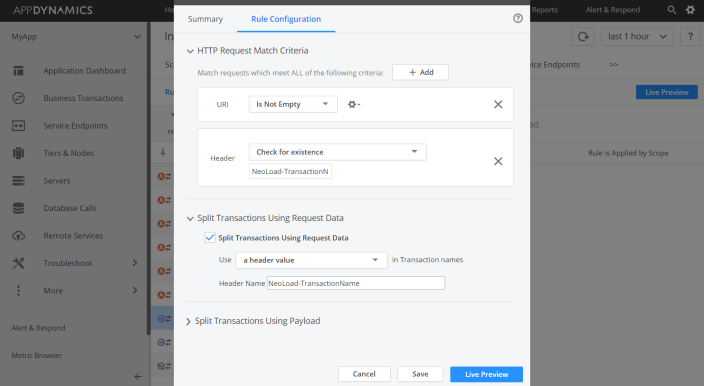 Clicking on the Save button validates the naming parameters. When a test is started in NeoLoad, AppDynamics is able to display the "NeoLoad-TransactionName" transactions in its Business Transactions list, as described in Read NeoLoad Information in AppDynamics.