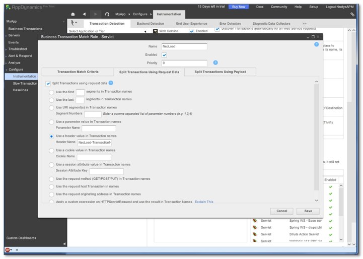 The option Use a header value in Transaction names must be selected and its value must be "NeoLoad-TransactionName".