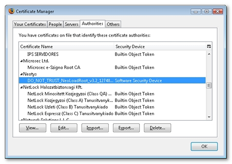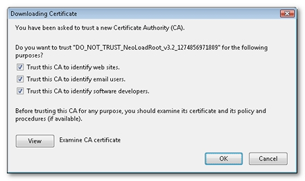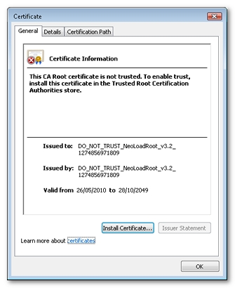 Installing the NeoLoad Certificate Authority certificate (NeoLoad_Root_CA.cer) in the browser certificate authority keystore enables each certificate generated during an SSL recording to be authenticated, thus preventing the certificate error messages in the browser. For more information about the NeoLoad Certificate Authority certificate, see Certificates.