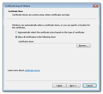 Click Next. The wizard prompts you to enter the store in which you want to place the certificate. Click the Place all certificates in the following store option.