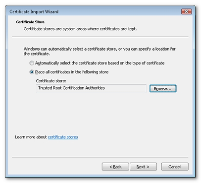 Click Browse and choose the Trusted Root Certification Authorities store.