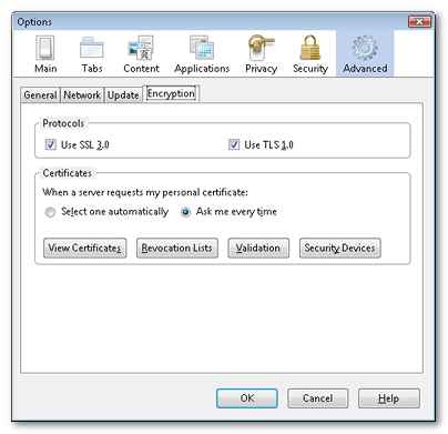 In the browser menu, go to Tools > Options and click on the Advanced button on the top right. Next, select the Encryption tab.