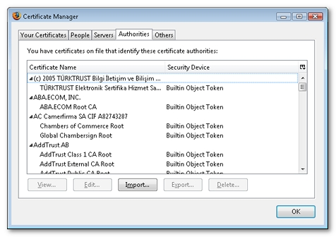 Click on the Authorities tab, then click Import to import a new certificate into the Trusted Root Certification Authorities store. An explorer window prompts you to select the folder containing the certificate to be imported. Check all three boxes so that the root certificate covers all types of applications.