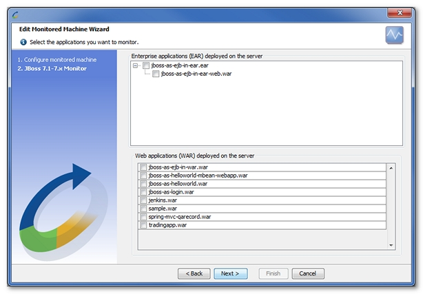 NeoLoad displays a list of the EARs (Enterprise Archive) and WARs (Web Application archive) deployed on the configured server. It then automatically selects the most appropriate counters for each of the selected applications.