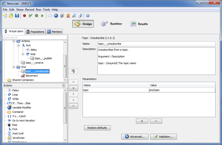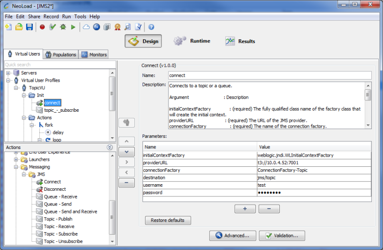 The Connect JMS Advanced action is used to connect to a topic or a queue.