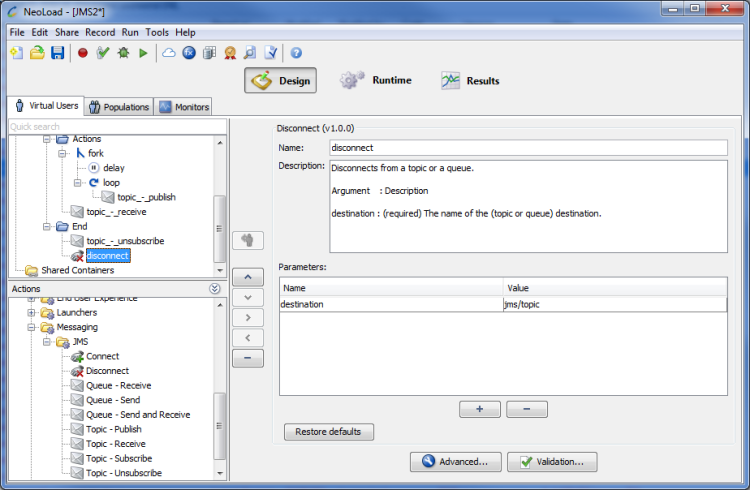 The Disconnect JMS Advanced action is used to disconnect from a topic or a queue.