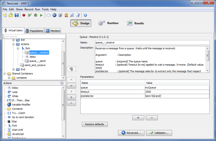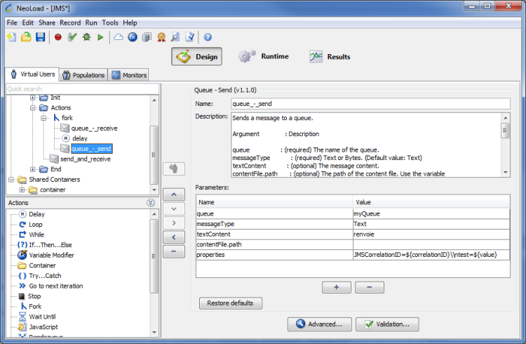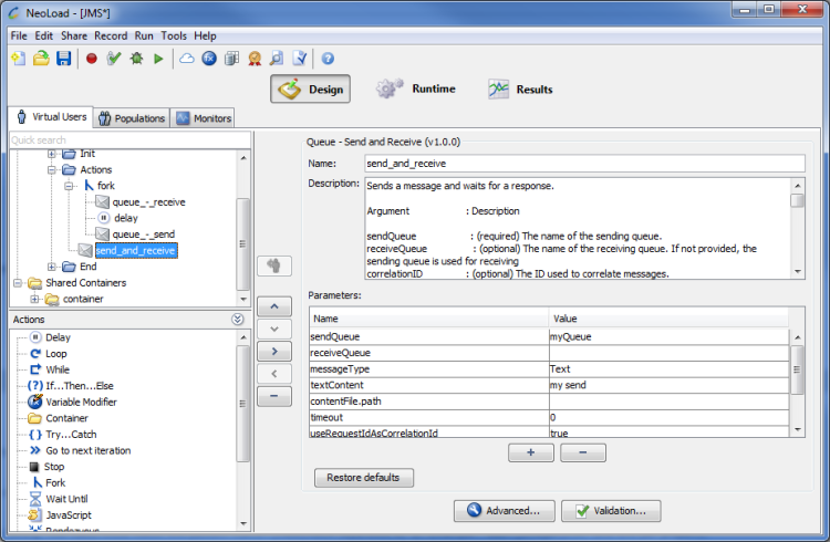 The Queue - Send and Receive JMS Advanced action is used to send a message. It waits for a response.