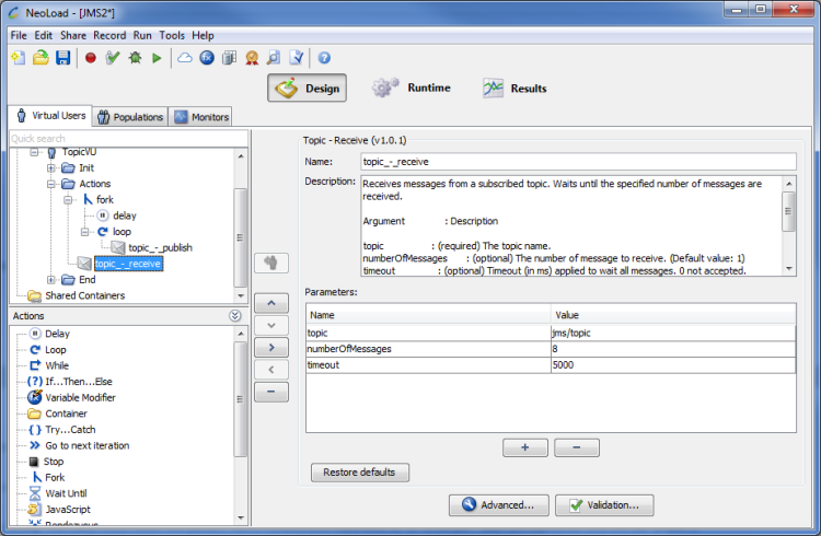 The Topic - Receive JMS Advanced action is used to receive messages from a subscribed topic. It waits until the specified number of messages are received.