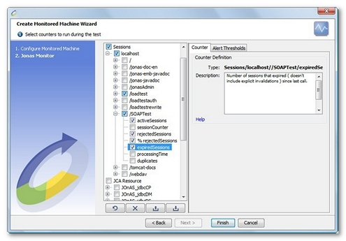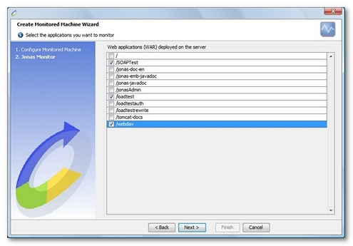 NeoLoad displays a list of the EARs (Enterprise Archive) and WARs (Web Application archive) deployed on the configured server. It then automatically selects the most appropriate counters for each of the selected applications.