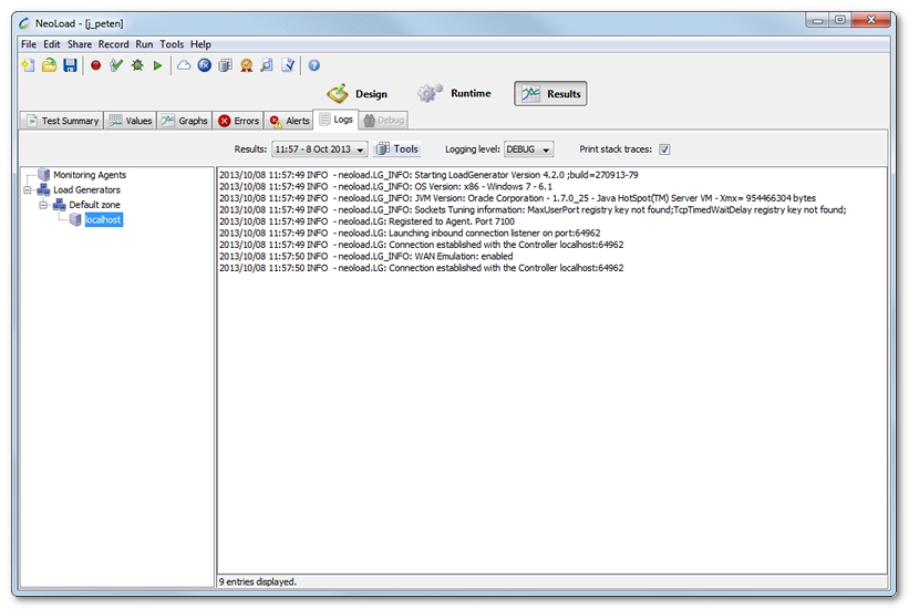 The Logs tabs allows you to view the log files of the various Load Generators and Monitoring Agents used during a test. The log can be viewed by selecting the Load Generator or Monitoring Agent in the tree.
