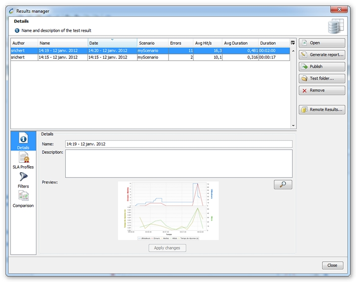 Choosing the Share > Publish Test Results command or clicking the button Publish one or several test results on collaboration server in the toolbar makes it possible to publish a test result. The results manager is displayed.