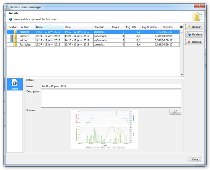 Choosing the Share > Retrieve Test Results command or clicking the button Retrieve one or several test results from collaboration server in the toolbar makes it possible to retrieve a test result. The remote results manager is displayed.