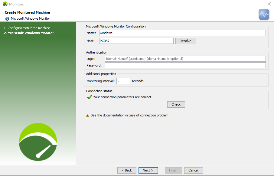 Login: The user account login associated with the monitored machine. When the domain name is to be specified (optional), the format must be: "{domainName}\\{userName}".