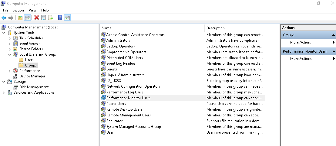 For more information about configuring the Performance Monitor Users group in Windows, refer to the image below