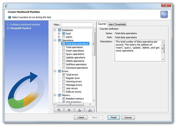 MongoDB monitors allow monitoring MongoDB database servers. The counters are sorted by category: operations, memory, and so on.