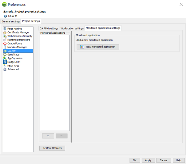 In the Monitored applications settings tab of the CA APM preferences panel, the New monitored application button can be used to add a new application to be monitored by a CA APM agent.