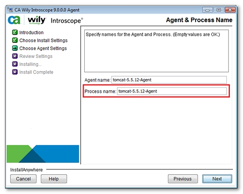 Process name: The CA APM agent process name is defined in the agent profile and corresponds to the agent process name as shown in CA APM. When the agent has been installed with the installer, the field corresponds to the name defined during installation.